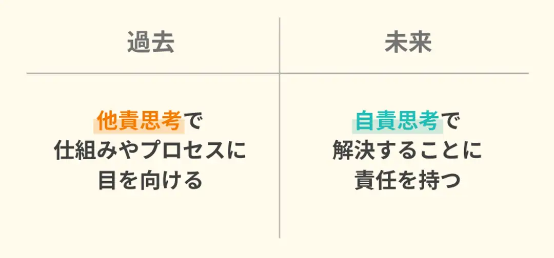 起きてしまった出来事に対して自責思考で考えてしまうと、メンタルヘルスを損なってしまう原因になったり、仕組みを改善する機会を失ってしまうことがあります。 自責思考を未来に向けることで、主体性を持ってチームや組織の改善に取り組むことができるのではないでしょうか。