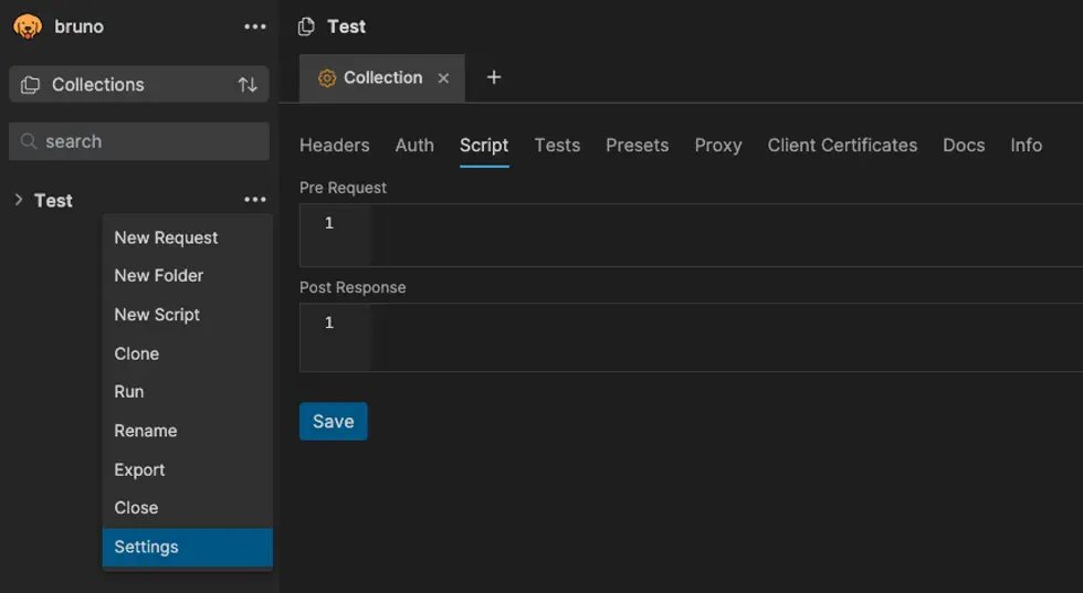 BrunoのCollectionのSettingを開くと、Collectionで共通する設定ができるようです。