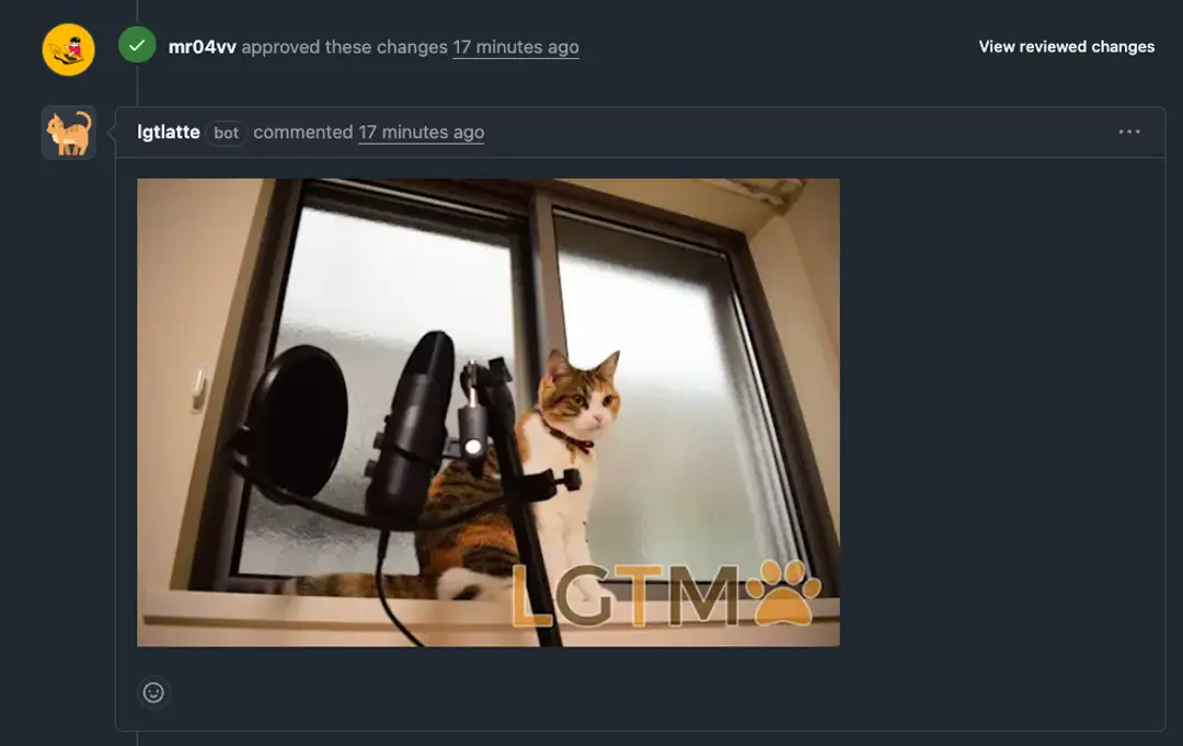 Pull Requestをレビューして「Approve」すると、自動的に猫の画像がコメントされます。