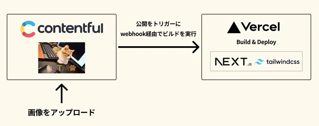 構成は以下のような感じで、Contentfulへの画像アップロードをトリガーにして、VercelでのSSGビルドを走らせるようにしています。