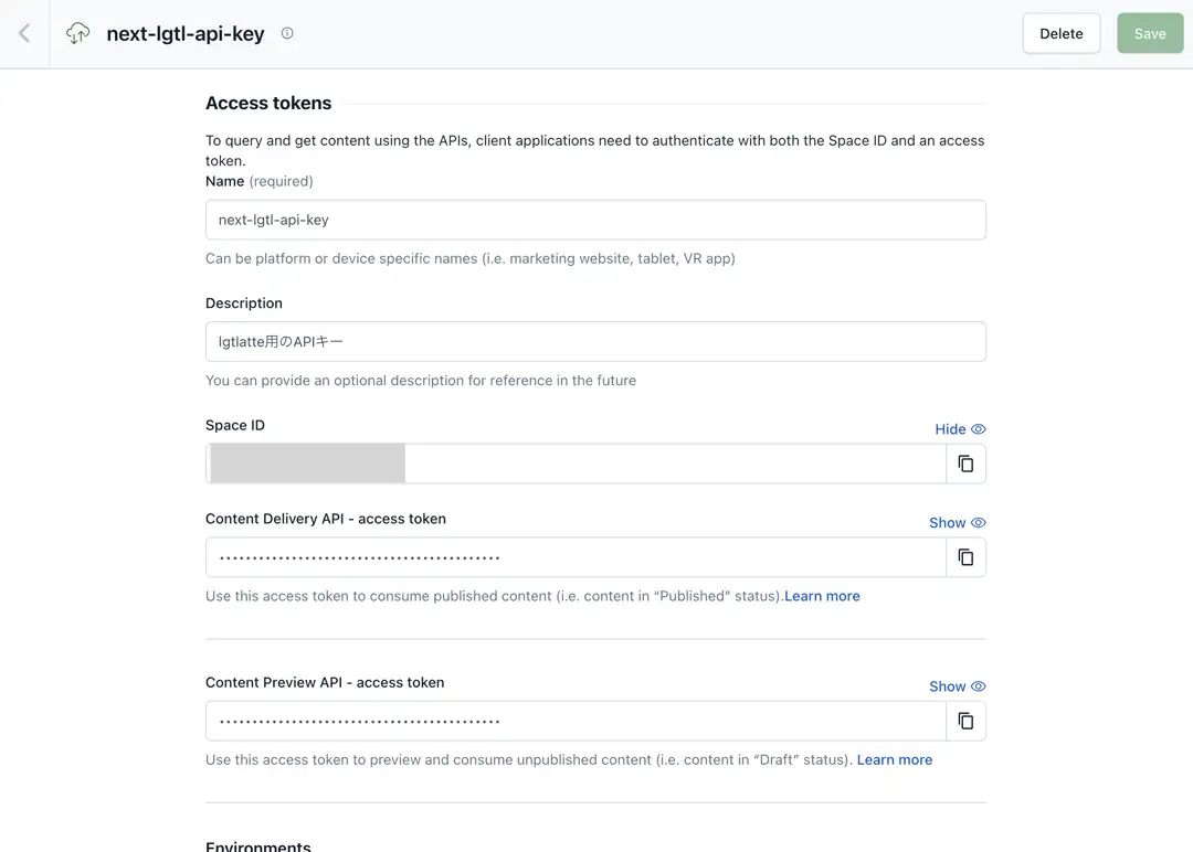 (実行時に.envからContentfulのSpaceIdとTokenを取得するようにしています。)