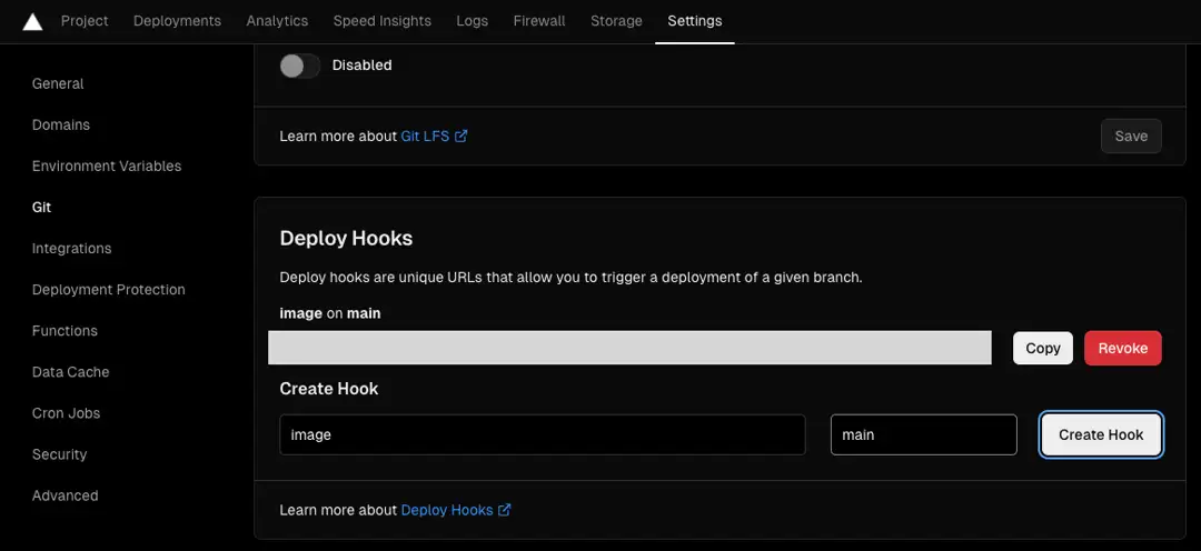 Vercelのプロジェクトの設定画面からWebhookのURLを生成し、コピーしておきます。